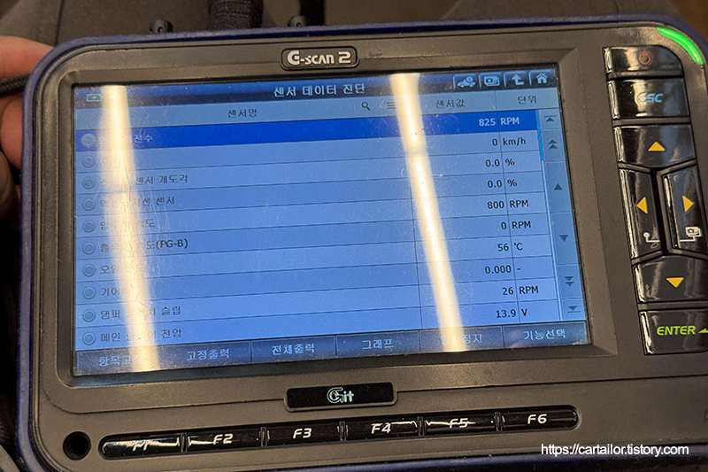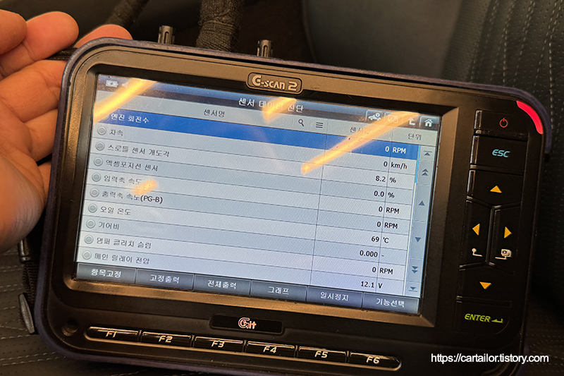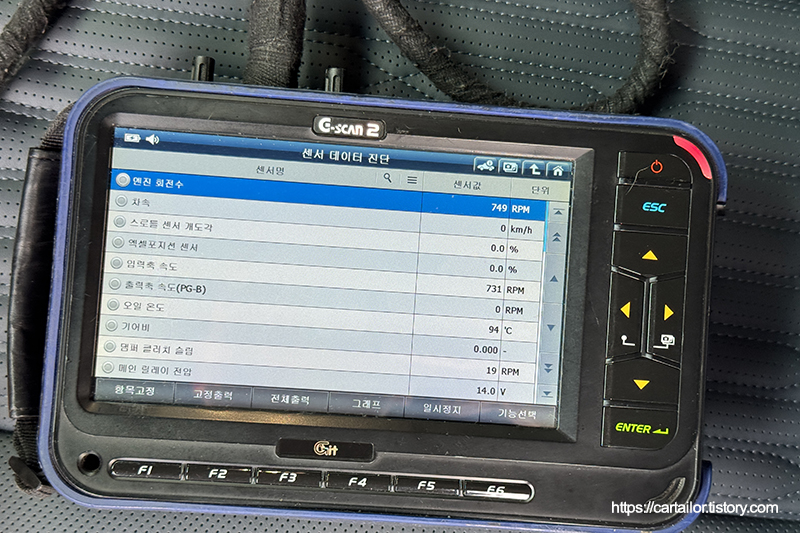입고 직후 확인한 미션오일온도로, 오일을 배출하기엔 온도가 높아 식히는 동안 디퍼런셜오일 먼저 교환합니다.