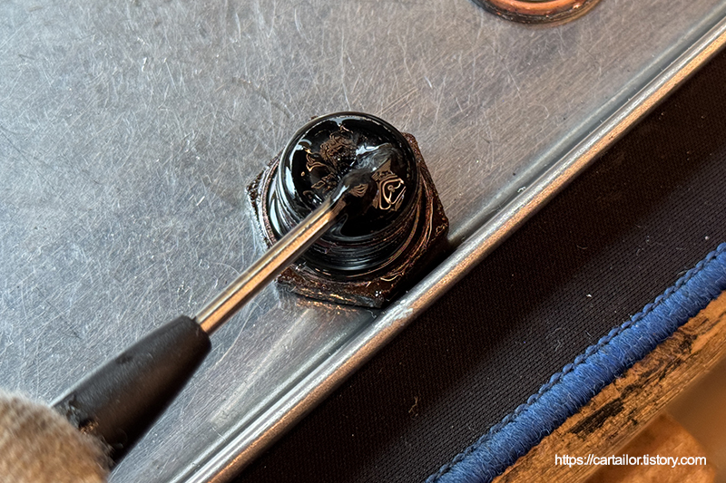 오버플로우 방식으로 신유를 주입합니다. 레벨링이 끝났으면 주입구플러그를 손으로 돌려준 뒤, 규정 토크로 체결해 마무리합니다.