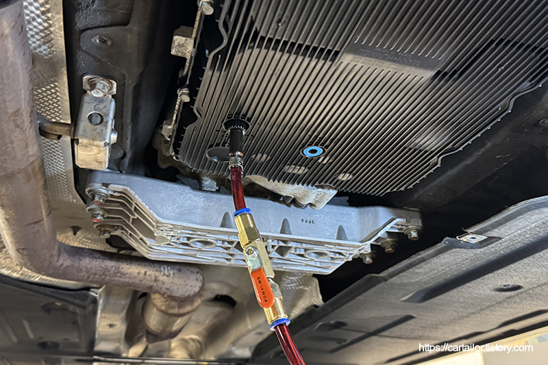 전용 어답터를 장착 후, 레벨링 작업을 감안한 용량의 신유를 주입합니다. 시동을 걸어 변속을 진행 후, N단에 위치해 레벨링 작업을 시작합니다.