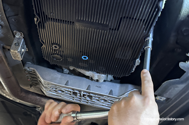 오일팬을 장착한 뒤, 신품 고정 볼트를 손으로 돌려 가고정합니다. 오일팬 위치 조정이 끝났으면 모든 규정 볼트들을 토크렌치를 이용해 규정 토크로 체결합니다.