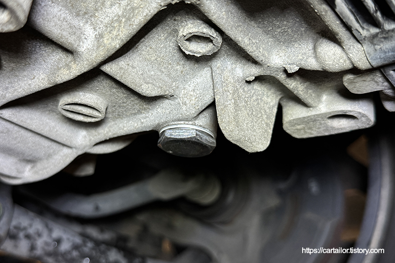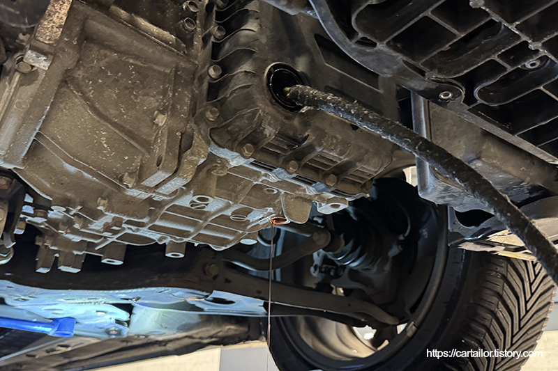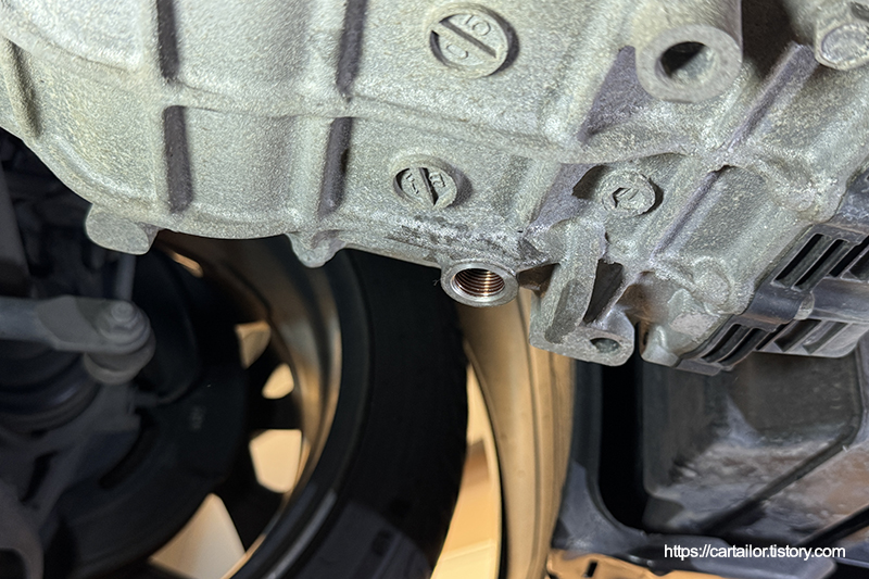 레벨링플러그를 개방해 과주입된 미션오일을 배출합니다. 레벨링플러그 오링을 신품으로 교환한 뒤, 오일이 미량 혹은 방울 단위로 떨어질 때, 레벨링플러그를 체결합니다.