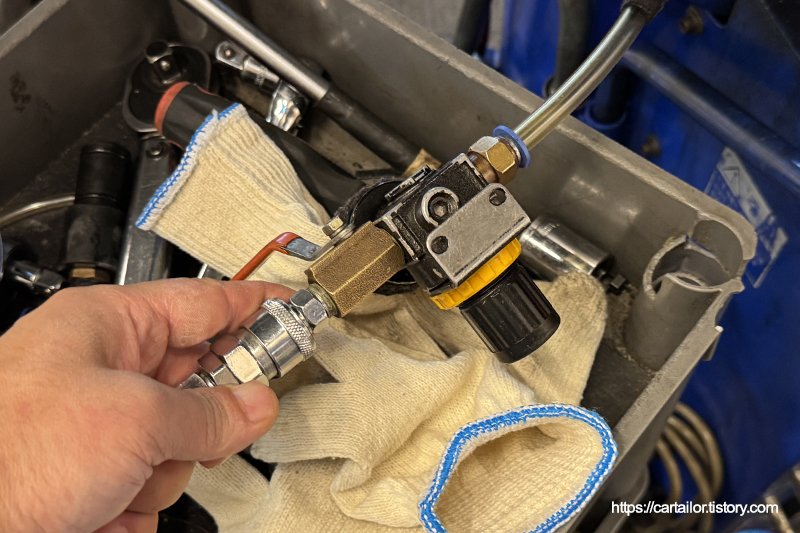 배출구 형상에 맞게 차를 기울인 뒤, 입으로 부는 정도의 세기로 에어를 세팅해 잔유를 배출합니다.