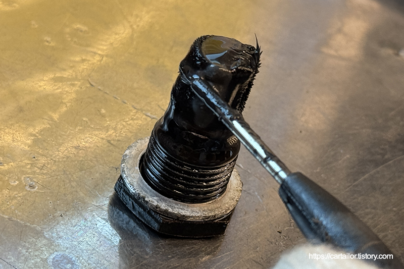 탈거된 드레인플러그의 모습으로 자성을 띄고 있어 마모에 따른 메탈성 슬러지를 포집하게 됩니다. 누적 키로수 대비 슬러지 양이 많지 않은 것을 보아 최근 교체 이력이 있어 보입니다.