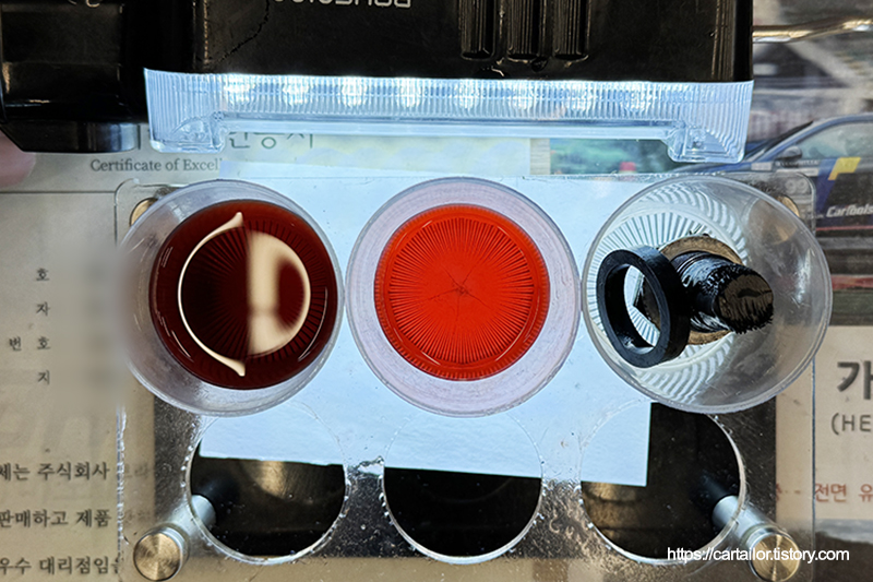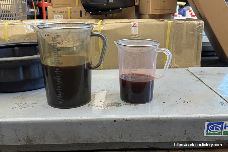 좌측부터 기존 사용유, 레벨링 시 배출된 오일 그리고 교체 후 폐기되는 소모품들입니다. 레벨링 시 배출된 오일이 현재 차량의 미션오일 상태로 보시면 되겠습니다.