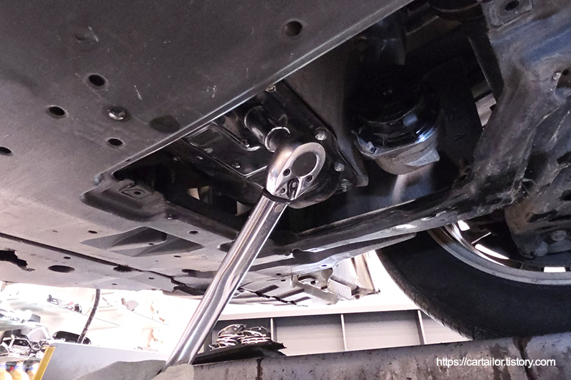 드레인플러그 와셔를 신품으로 교환합니다. 오일 배출이 완전히 끝났으면 플러그를 손으로 돌려준 뒤, 토크렌치를 이용해 규정 토크로 체결합니다.