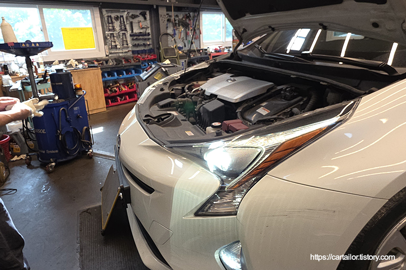 엔진오일교환을 위해 입고된 프리우스 하이브리드 차량입니다. 90년대 말 출시된 도요타 프리우스는 세계최초의 하이브리드 자동차 입니다. 지금이야 하이브리드며 심지어 전기차를 도로에서 심심치 않게 보는 시대에 살게 되었지만 90년대 후반, 저속 주행은 전기로, 높은 출력이 요구될 때는 엔진이 개입되는 하이브리드의 구동방식과 리터 당 20키로를 넘는 연비는 미래에서 타임머신을 타고 온 듯한 신문물이자 얼리어답터들의 워너비 자동차였습니다.