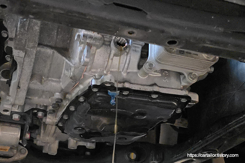 오일이 미량 혹은 방울 단위로 떨어지기 시작할 때, 신품 와셔로 교체한 레벨링플러그를 손으로 돌려 가체결합니다.