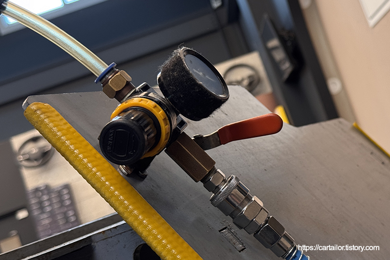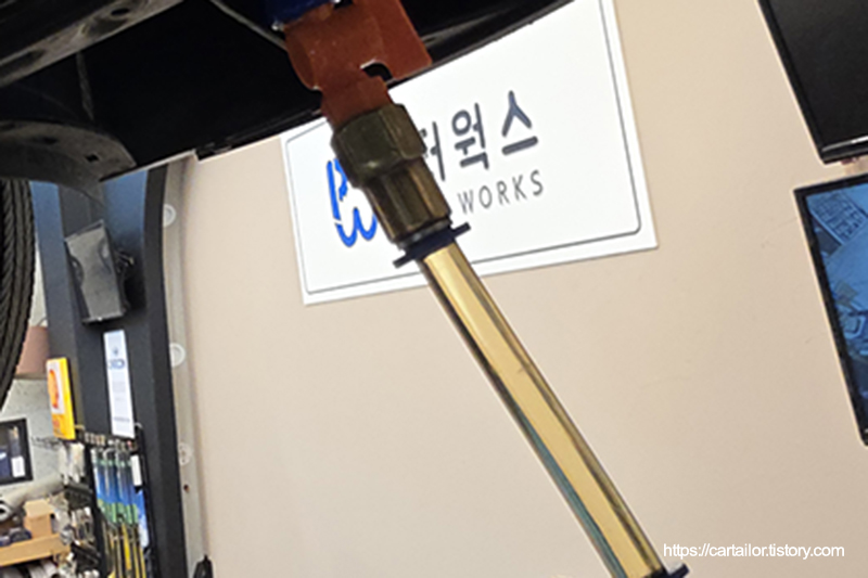 자연 낙하 방식의 배출이 끝났으면 배출구 형상에 맞게 차량을 기울인 뒤, 마일드한 세기로 에어를 불어넣어 오일이 더 이상 나오지 않을 때까지 잔유를 배출합니다.