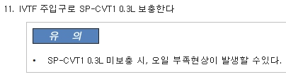 주입할 IVT오일은 현대 CVTF(SP-CVT1)으로 해당 차량이 요구하는 정확한 규격과 점도의 순정 오일입니다.