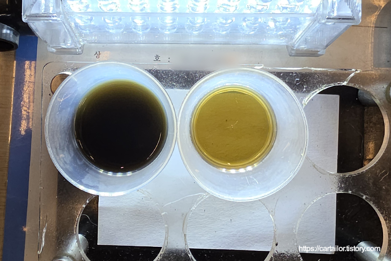 좌측은 기존 사용유, 우측은 레벨링 시 배출된 오일입니다. 우측이 현재 차량의 변속기 오일 상태로 보시면 되겠습니다.