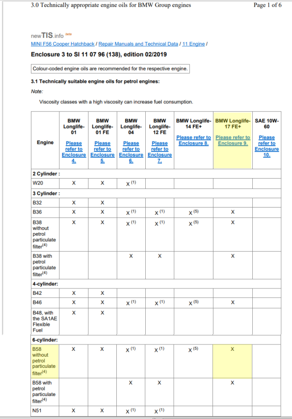 해당 가솔린 직렬 6기통의 터보차져 엔진이 요구하는 엔진오일은 BMW LL-01, LL-01FE이 사용가능 규격이며, 추천 규격은 LL17FE+입니다. 표를 보면, LL-04와 LL-12 그리고 LL-14FE+ 역시 사용이 가능한 것으로 표기가 되어있으나, 붙어있는 각주를 보면 아래와 같은 조건이 붙기 때문에 대한민국에서는 허용되는 규격이 아닙니다.
