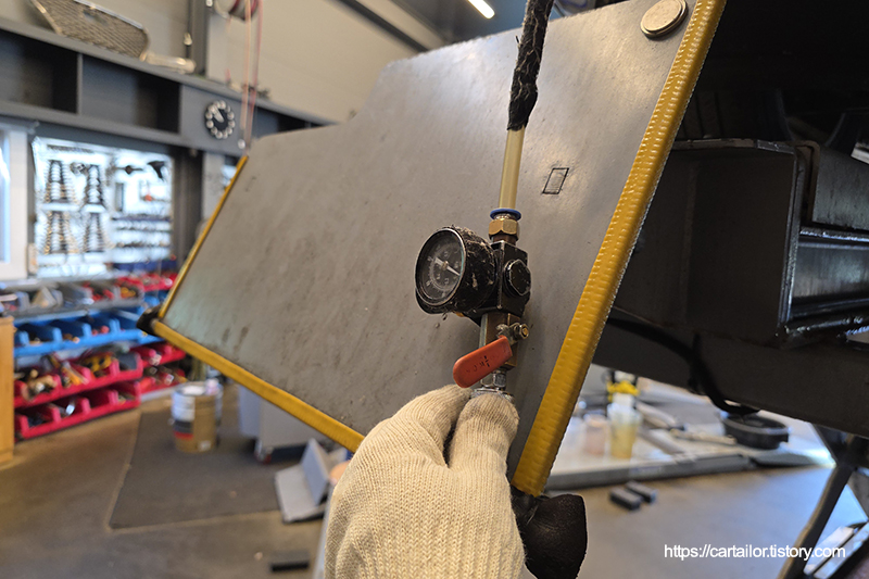 잔유 제거를 위해 전용 어답터와 호스를 연결 후 차량을 리프팅합니다.