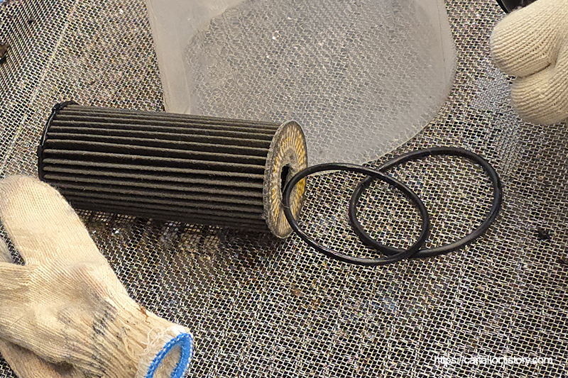 엔진룸 내부 깊숙히 숨어있는 오일필터캡을 탈거해 카트리지필터와 오링 2개를 제거합니다.