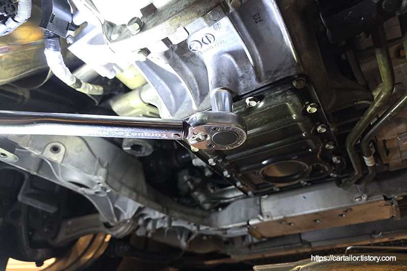 오일 배출이 완전히 끝났으면 플러그를 손으로 끝까지 돌려준 다음 토크렌치를 이용해 규정 토크로 체결합니다.