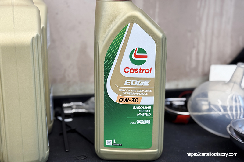 주입할 엔진오일은 캐스트롤 엣지 0W-30입니다. 해당 차량이 요구하는 엔진오일 규격과 점도와 정확히 일치하는 100% 합성유입니다. 세계적으로 유명한 메이커인 만큼 병행수입품도 많고 가품이 많이 유통되는 제품이기도 합니다.