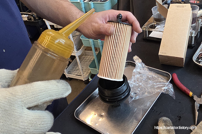 전용 세정제를 이용해 세척 및 건조를 마친 필터캡에 신유를 바른 신품 오링과 카트리지 필터를 결합합니다. 필터캡을 손으로 돌려준 뒤, 토크렌치를 이용해 규정 토크로 체결합니다.