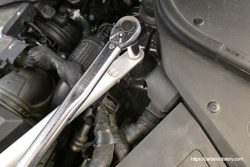 오일필터 교체를 위해 탈거했던 스트럿바를 장착 후, 토크렌치를 이용해 체결합니다.