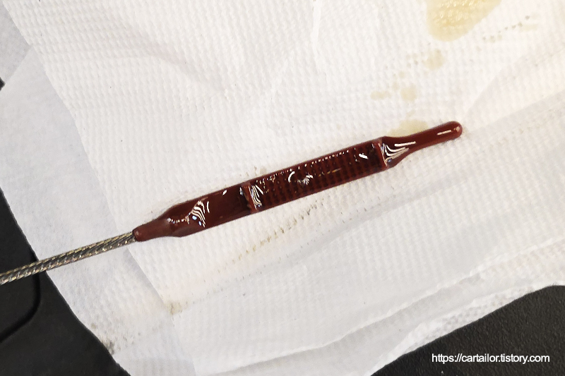 열간 상태에서 시동을 끄고 15분 후, 딥스틱을 뽑아 오일 상태를 체크합니다. 기존에 들어있는 엔진오일량은 과다이며, 오일 상태는 양호합니다.