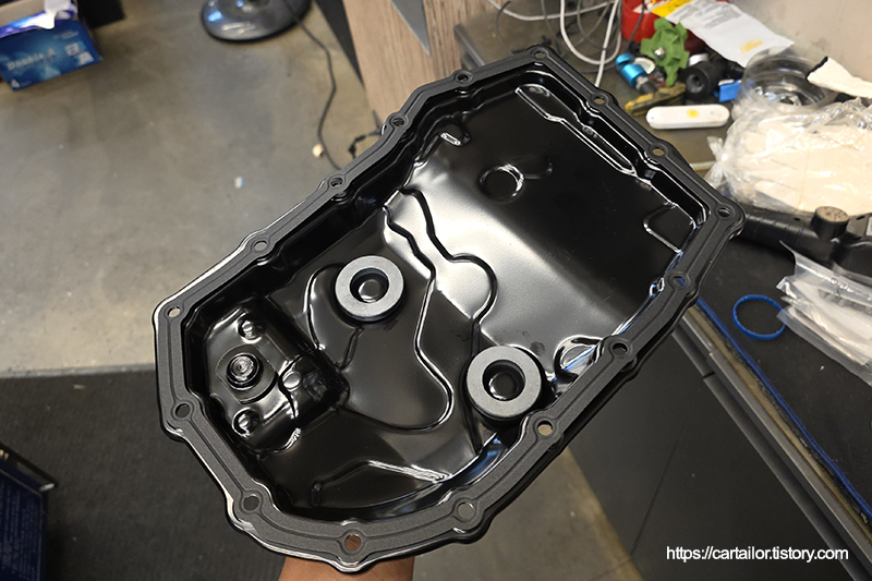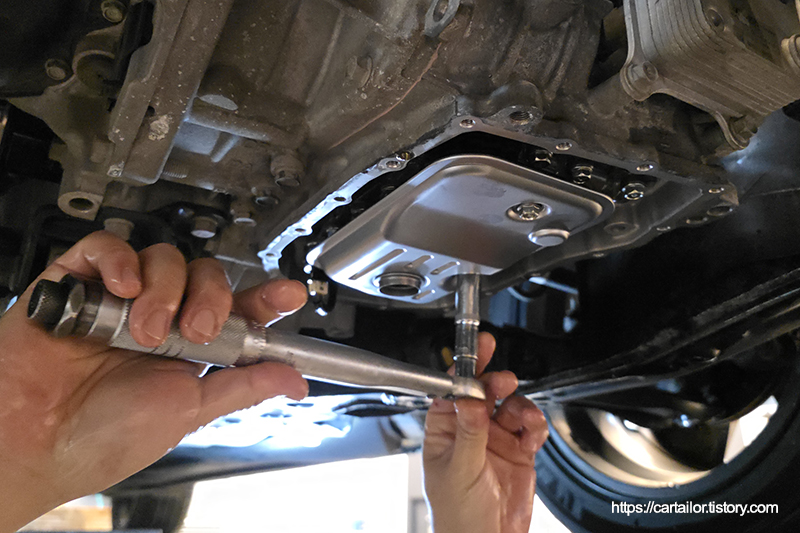 밸브바디커버를 장착 후, 신품 고정 볼트를 손으로만 돌려 오일팬 위치 조정이 가능하도록 해줍니다. 오일팬과 가스켓의 위치가 정위치가 되었으면 토크렌치를 이용해 모든 고정 볼트들을 규정 토크로 체결합니다.