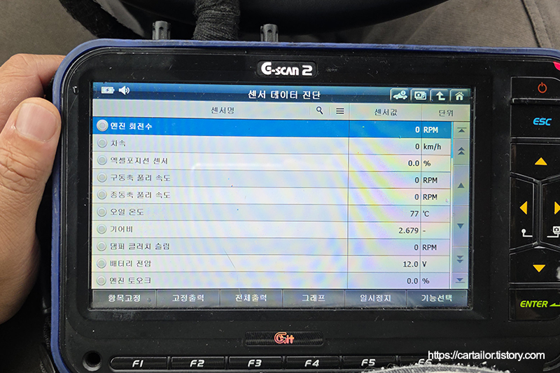 입고 직후 확인한 변속기 오일 온도로, 오일을 배출하기엔 온도가 다소 높아 팬을 이용해 식히는 시간을 가집니다.