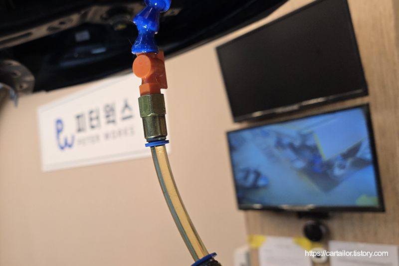 언더커버를 탈거 후, 측면에 위치한 압력필터를 제거합니다. 필터캡을 전용 세정제를 이용해 세척 및 건조시켜줍니다.