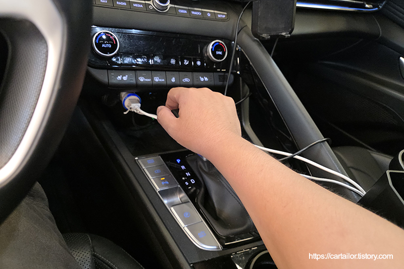 미션오일레벨링을 감안한 용량의 신유를 주입 후 시동을 걸어 신유 순환을 진행합니다. P단에 위치 후 레벨링 작업을 시작합니다.