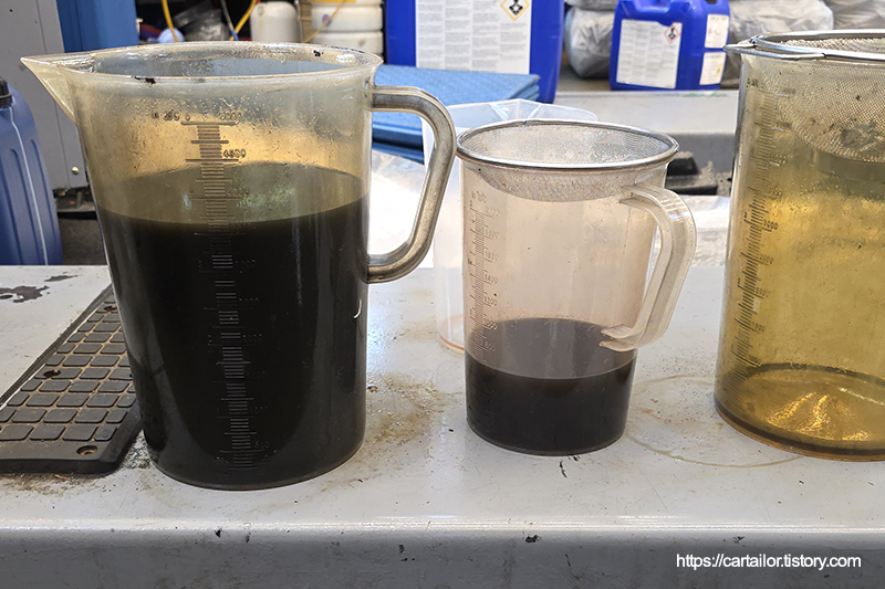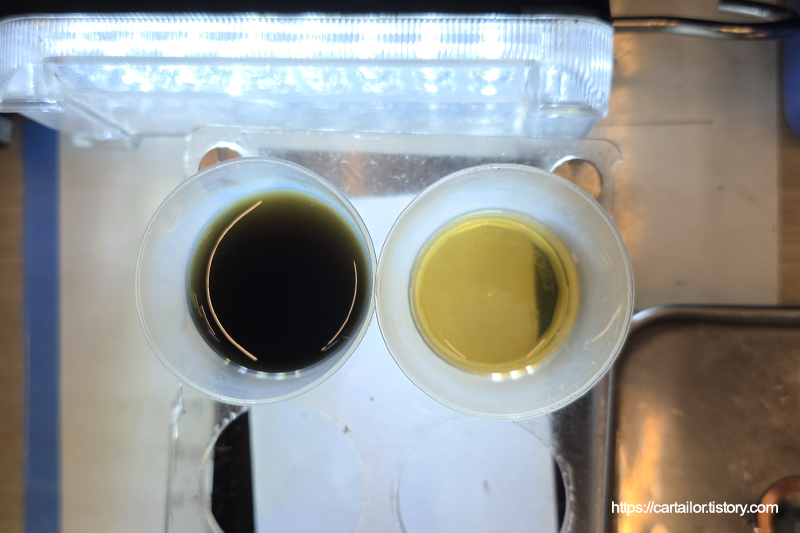 좌측은 기존 사용유, 우측은 레벨링 시 배출된 오일입니다. 우측이 현재 차량의 변속기 오일 상태로 보시면 되겠습니다.