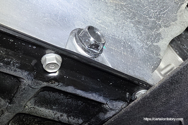 드레인플러그 와셔를 교환합니다. 오일 배출이 완전히 끝났으면 플러그를 손으로 끝까지 돌려준 뒤, 토크렌치를 이용해 규정 토크로 체결해 마무리합니다.