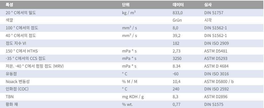 냉간(40도) 및 열간(100도) 상태일 때의 점도의 경우 각각 39.2mm² / s 그리고 8.0mm² / s 로 일반적인 0W-20 엔진오일들 대비 낮은편에 속합니다. 즉 냉간 상태부터 열간 상태까지 저항을 최소화 할 수 있으며 엔진의 작동온도가 빠르게 열간 상태로 도달하고 냉각효과도 우수합니다.