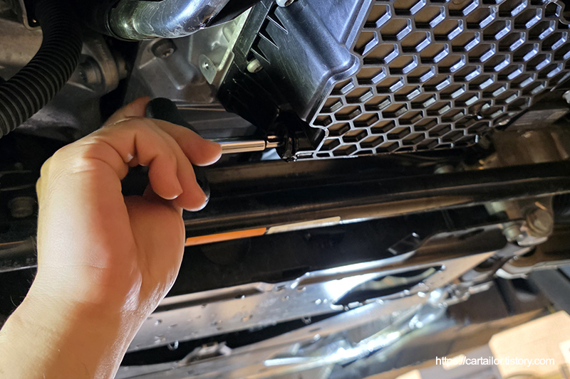 언더커버를 탈거 후, 드레인플러그를 제거해 엔진오일을 배출합니다.