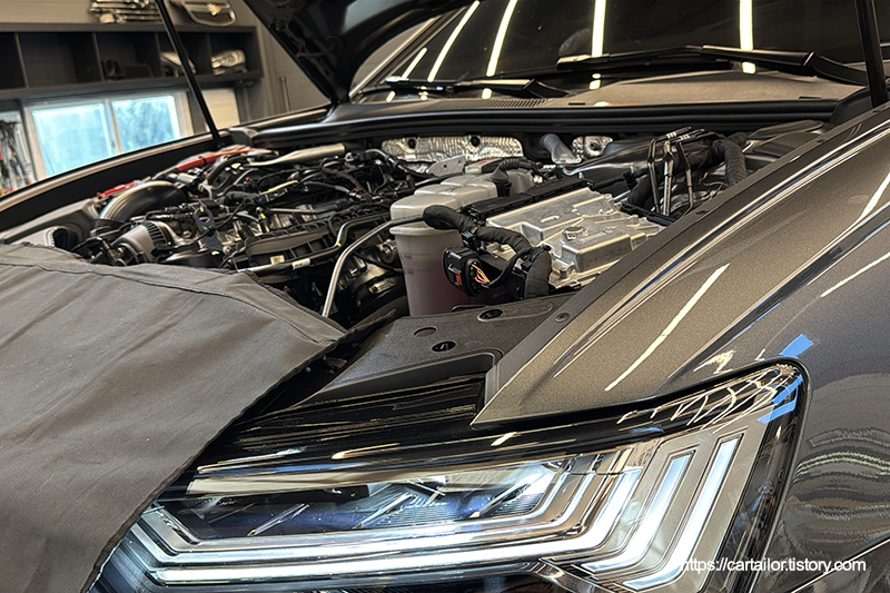 엔진오일교환 작업을 위해 입고된 A6(C8) 45 TFSI 모델입니다. 국내에 수입되는 아우디 A6가솔린의 유일한 모델로 4기통 2.0리터 터보인 폭스바겐그룹의 EA888 엔진과 7단 DCT 자동변속기가 장착됩니다. 출력은 252ps와 37.7kgf·m의 토크를 발휘하기 때문에 출력면에서 큰 아쉬움은 없습니다만 차급을 생각하면 6기통 엔진의 부재가 아쉬운건 사실입니다. 하지만 다운사이징이 범세계적인 트렌드로 자리잡은지 이미 오래되었기 때문에 이제는 6기통 엔진의 감성을 느끼려면 플래그쉽 모델을 선택해야 하는 경우가 대부분입니다.
