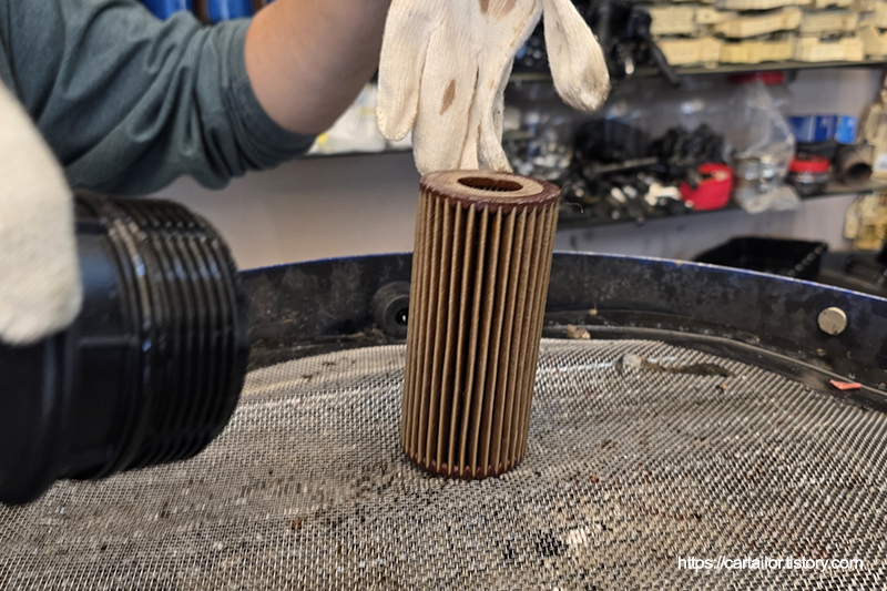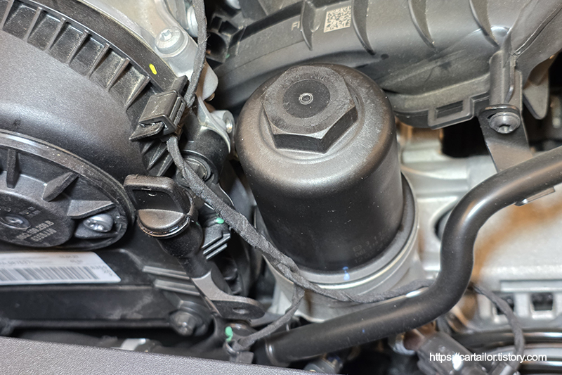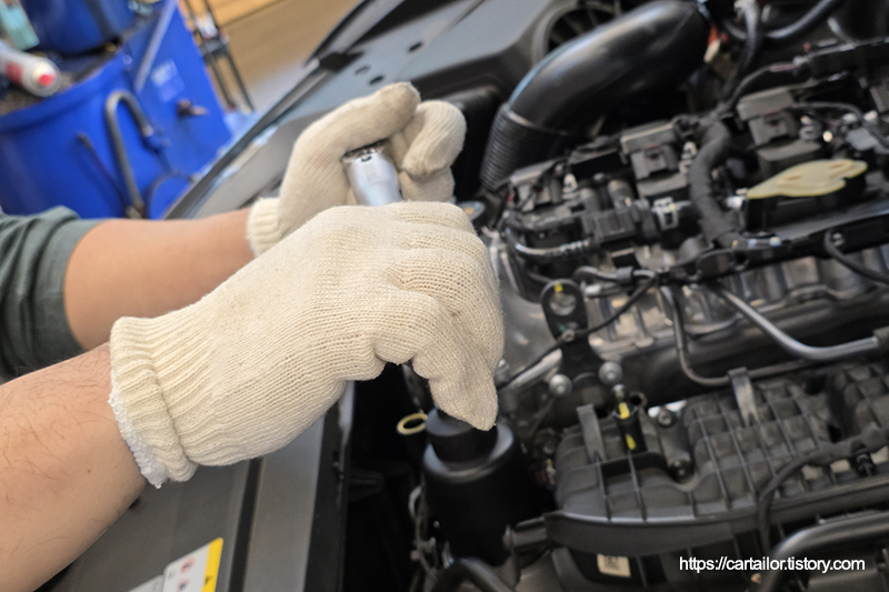오일필터캡을 탈거해 오일필터를 제거합니다. 필터캡은 전용 세정제를 이용해 세척합니다.