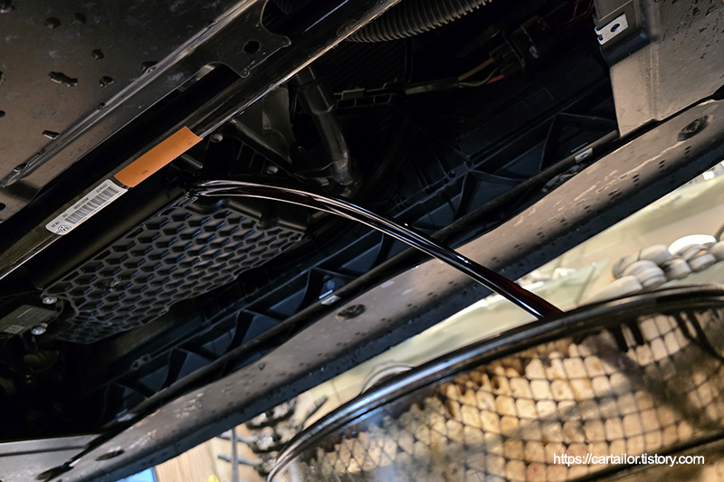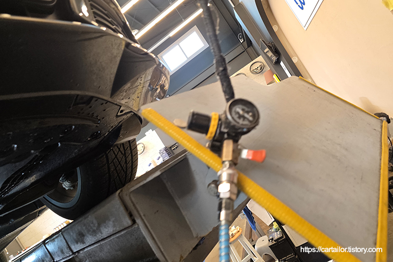 엔진오일 잔유 제거를 위해 호스를 연결 후 차량을 리프팅합니다.