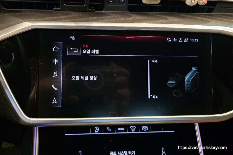 MMI를 통해 오일 레벨 먼저 체크합니다. 정량을 잘 유지하고 있습니다.