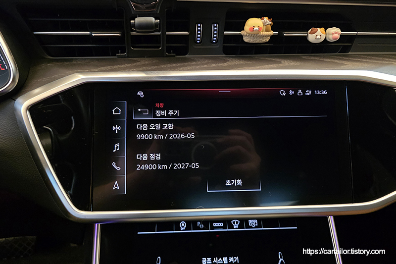 열간 상태에서 시동을 끄고 수분 후, MMI를 통해 오일 레벨을 체크합니다. 정량 잘 세팅되었습니다.