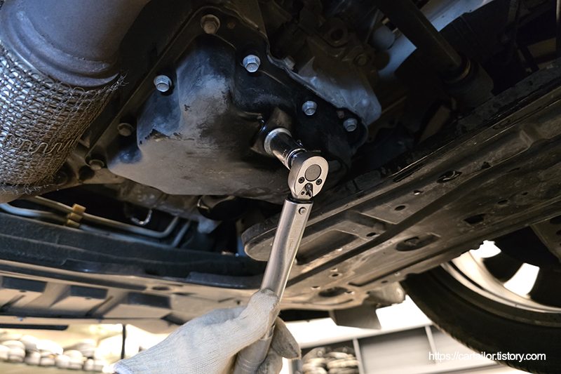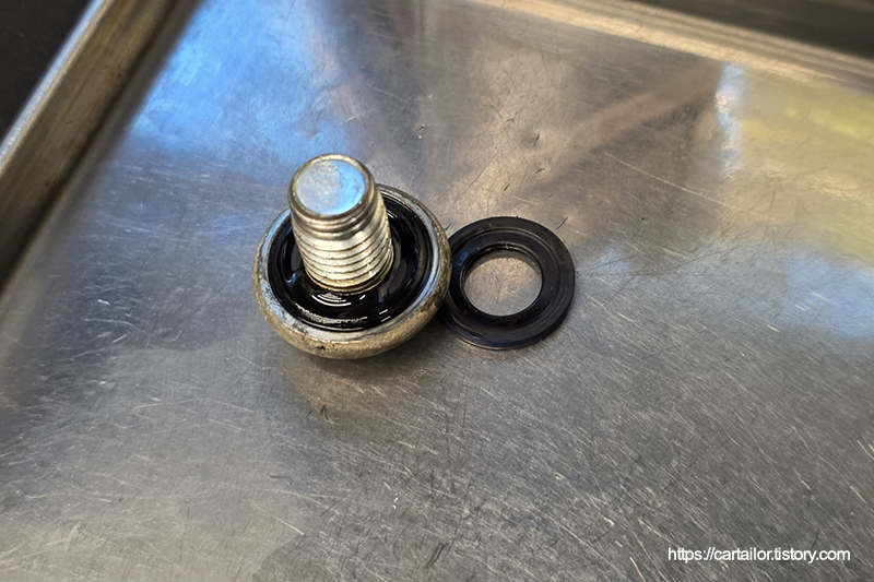 드레인볼트의 고무 오링도 신품으로 교체 합니다. 오일필터와 마찬가지로 오링에 신유를 살짝 도포 후 손으로만 꽉 잠근 다음 토크렌치를 사용하여 정확한 토크로 체결합니다.