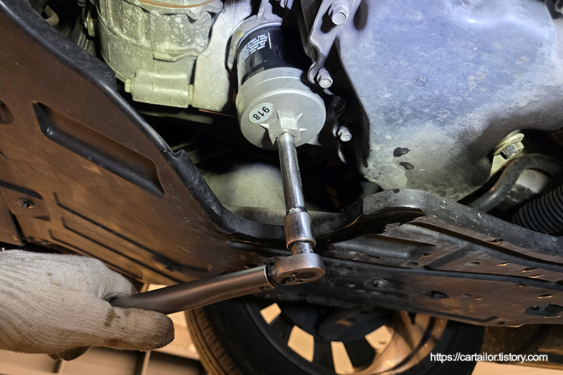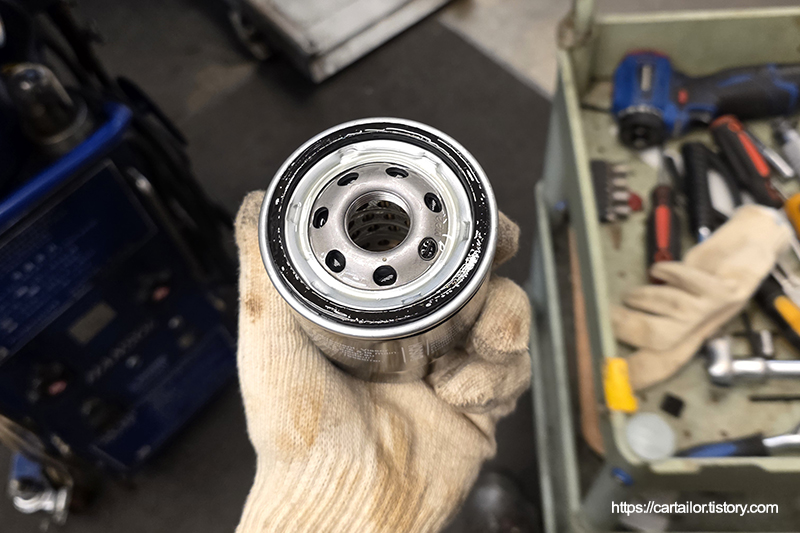 잔유가 배출되는 동안 오일필터를 준비합니다. 캔타입이기 때문에 엔진쪽 장착면을 잘 클리닝 후 건조하고 필터 오링에 신유를 살짝 발라 조립 중 오링이 변형되거나 파손되지 않도록 합니다. 조립은 손으로만 꽉 잠근 후 특이사항이 없으면 토크렌치를 사용하여 규정된 잠금값으로 마무리체결 합니다.