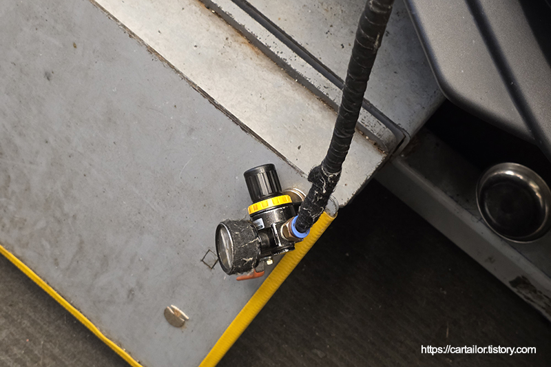 마일드한 잔유제거를 위해 에어 호스를 연결 후, 차량을 리프팅합니다.