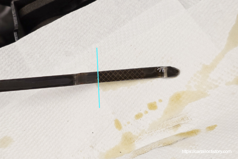 열간 상태에서 시동을 끄고 수분 후, 딥스틱을 뽑아 오일 상태를 체크합니다. 상태는 양호한 편이나, 오일이 미니멈도 찍히지 않는 상태입니다.