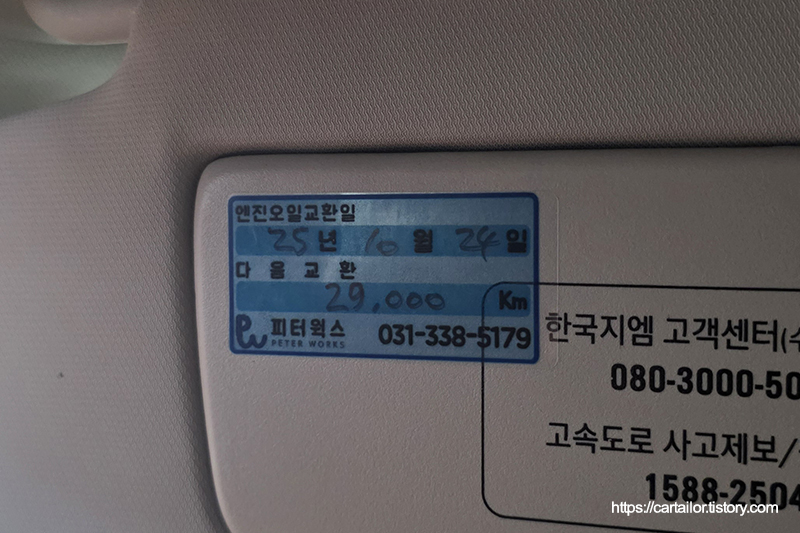 엔진 오일 수명 초기화 및 다음 교환주기를 기재한 스티커를 선바이저에 부착 후 출고합니다.