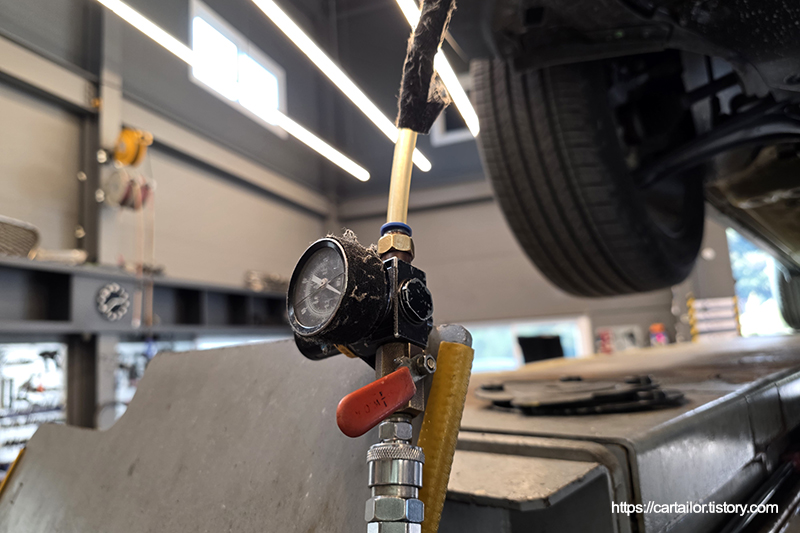 자연 낙하 방식의 엔진오일 배출이 끝났으면 입으로 부는 세기로 에어를 세팅해 잔유를 배출합니다.