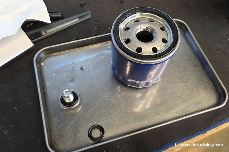 신품 오일필터 오링에 신유를 발라 준비합니다. 드레인플러그 씰링도 신품으로 교체 후, 신유를 발라 둡니다.
