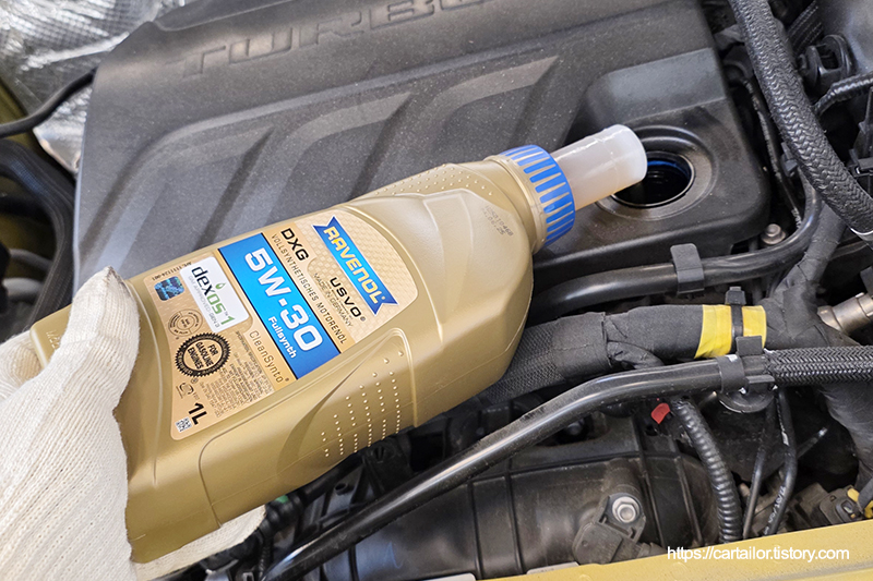 주입할 신유는 라베놀 DXG 5W-30제품으로, 해당 차량이 요구하는 DEXOS1 GEN3 규격의 공식 승인유이며, 에스터와 PAO를 베이스로 하는 4기유 및 5기유로 구성된 베이스유 기반에 DEXOS1 GEN3 첨가제 패키징이 첨가된 100% 합성유입니다.