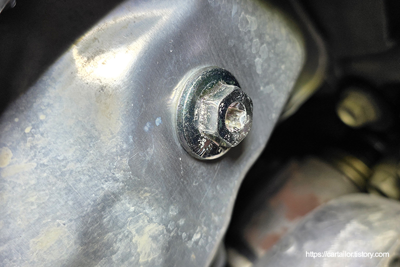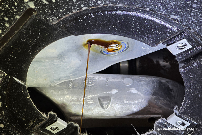 오일 배출이 완전히 끝났으면 오일필터와 드레인플러그를 손으로 돌려준 뒤, 토크렌치를 이용해 규정 토크로 체결합니다.