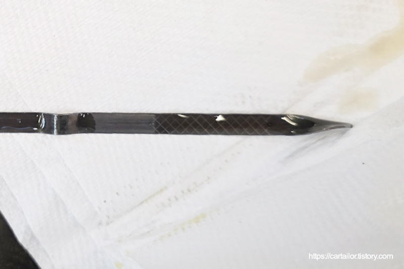 시동을 끄고 수분 후, 딥스틱을 뽑아 오일 상태를 체크합니다. 육안상 보이는 오일 상태 및 오일량 모두 양호합니다.