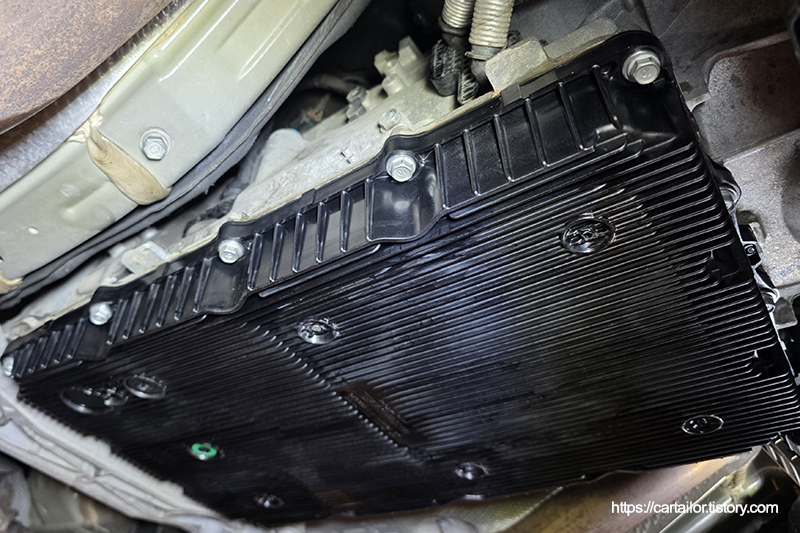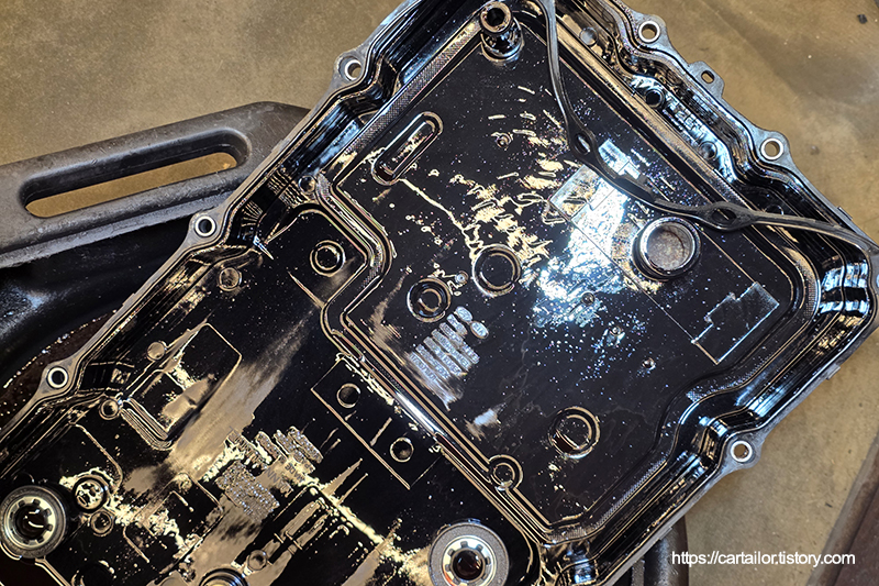신품 오일팬과 고정 볼트입니다. 필터 일체형으로 되어 있어 일반적인 전륜 6/8단 파워텍과 비교해 필터 교체가 가능한 장점이 있습니다. 게다가 가스켓까지 모두 일체형이기 때문에 부품 수급이 편해서 좋고, 가끔 분리형 가스켓(특히 메탈재질)의 경우 배송 과정에서 변형되어 다시 신품으로 교환해야 하는 번거로움이 종종 있는데 그런 걱정도 없습니다. 신품 필터 삽입부 씰링에 신유를 발라 윤활해줍니다.