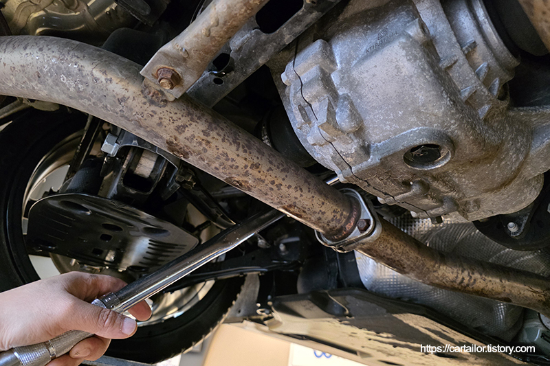 디퍼런셜 오일 배출이 완전히 끝났으면 드레인플러그를 손으로 돌려준 뒤, 토크렌치를 이용해 규정 토크로 체결합니다.