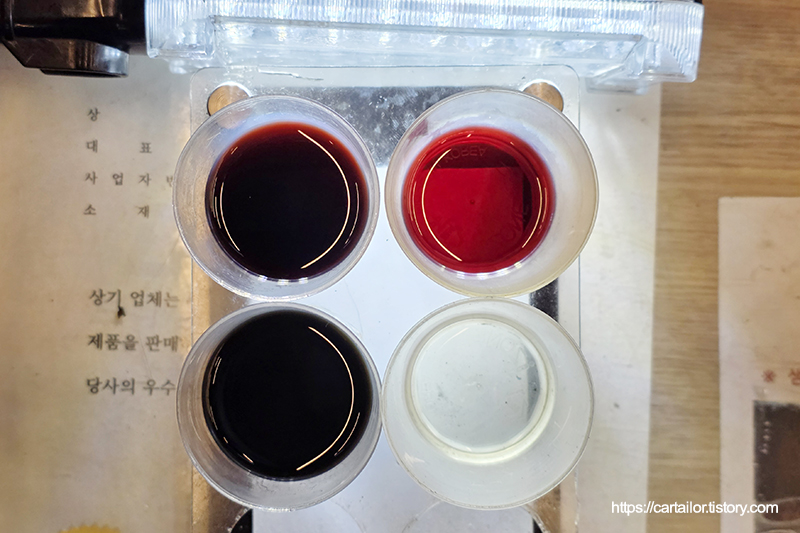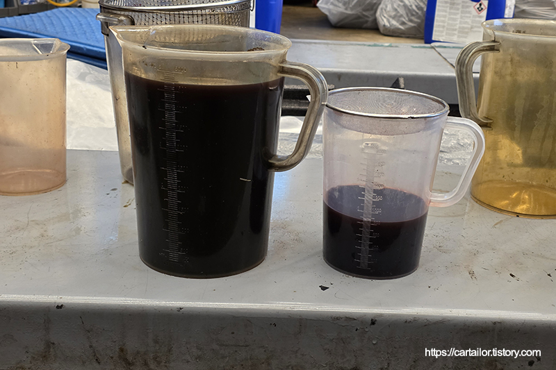 상단 좌측은 기존 미션오일, 우측은 레벨링 시 나온 오일입니다. 우측이 현재 차량의 변속기 오일 상태로 보시면 되겠습니다. 하단 좌측은 기존 디퍼런셜, 우측은 신유입니다.