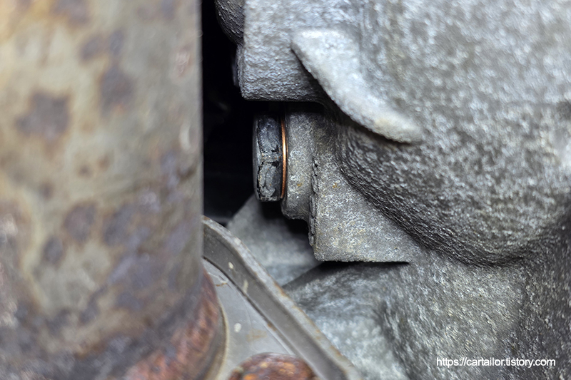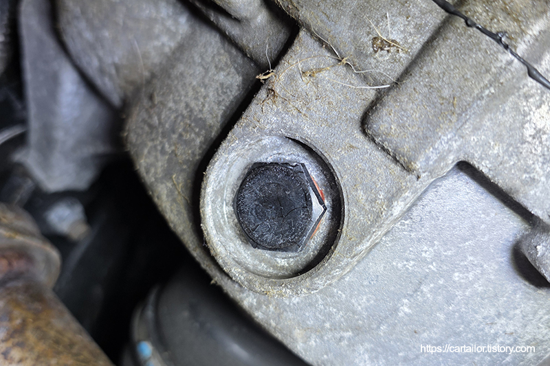 레벨링플러그를 개방해 과주입된 미션오일을 배출합니다. 배출 양상이 미량 또는 방울 단위로 바뀌면 한손에 들고 있던 신품 레벨링플러그로 재빨리 잠가 줍니다.