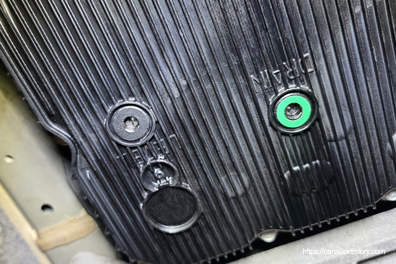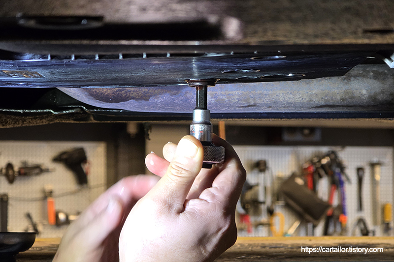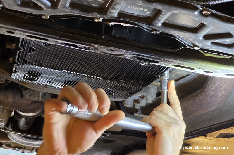 언더커버를 탈거 후, 미션오일을 배출합니다. 오일 배출이 끝났으면 오일팬을 탈거합니다.